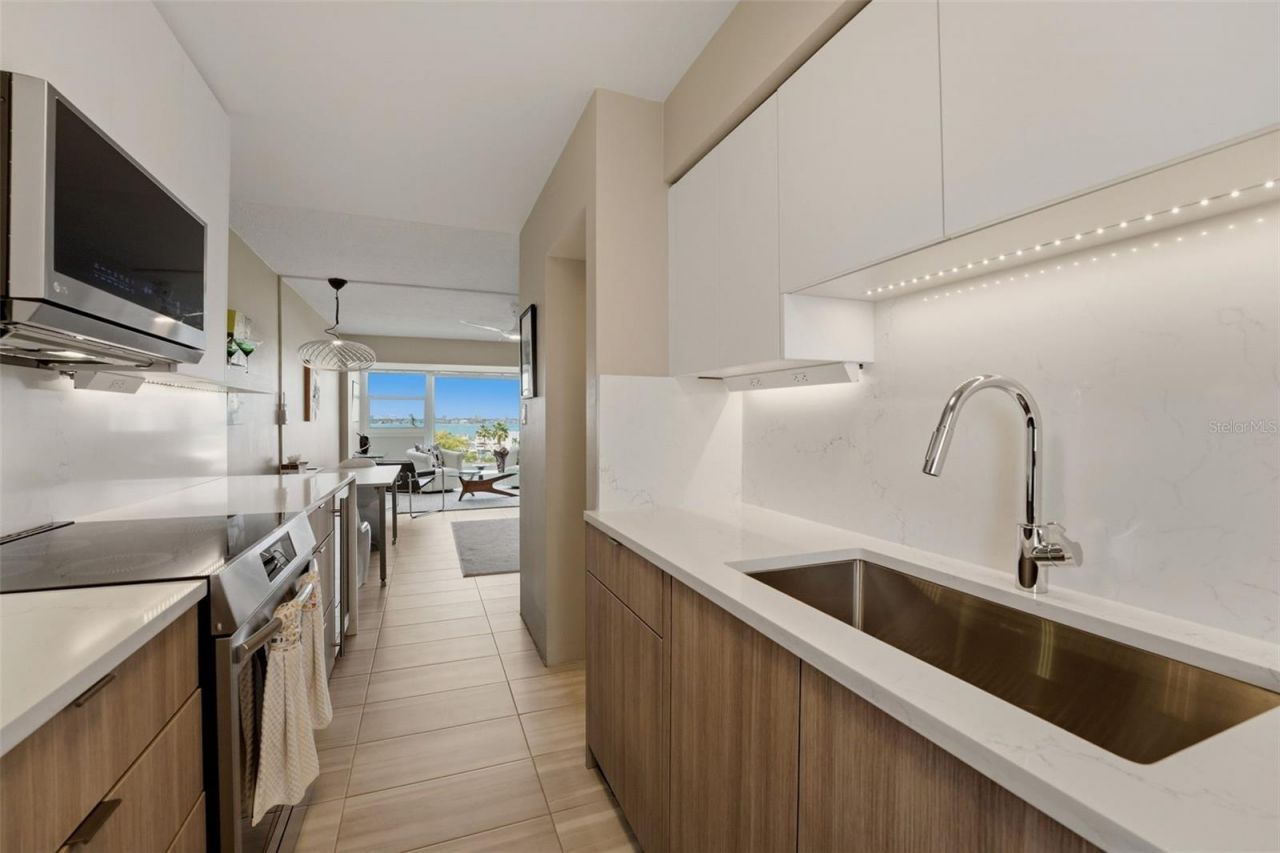 Your pied-à -terre for city living in Sarasota awaits you in Gulfstream Towers! Where fully renovated interiors meet panoramic Sarasota Bay and Marina Jack views. This move-in ready residence offers the ideal combination of waterfront living, walkability, and flexible space design in one of downtown Sarasota's most desirable locations. This light-filled residence features impact windows and doors and expansive glass framing unobstructed views of Sarasota Bay and Marina Jack. The interior has been fully renovated with high-end finishes, highlighted by a modern galley kitchen with quartz countertops, large single-basin sink, wine cooler, sleek cabinetry, stainless steel appliances, water filtration system, and LED accent lighting, all flowing seamlessly into the open living and dining areas. A standout feature is the Clei Italian custom-built Murphy bed system, allowing the space to effortlessly transition between a living area and bedroom, ideal for full-time living, seasonal use, or a lock-and-leave lifestyle. Additional highlights include tile flooring throughout, contemporary finishes, efficient layout, and abundant natural light.Located in a secure waterfront building, residents enjoy amenities including a heated pool with expansive furnished sun deck, fitness center, private storage, community/entertaining room with full kitchen and dining area, library, bike storage, and laundry facilities on each floor. With only 9 units per floor, the building offers a quiet, boutique feel. Prime downtown Sarasota location-just steps to Marina Jack, Bayfront Park, Selby Gardens, award-winning restaurants, theaters, the Sarasota Opera House, and year-round cultural events. Complimentary trolley service provides convenient access to St. Armands Circle and Lido Key beaches. Buyer to verify all measurements, HOA fees, rental restrictions, and pet policies.